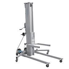 The Genie SLC-18 is a manually operated material lift designed to raise, lower and move loads on job-sites. It features a telescoping mast and is compact when stowed for easier transport and storage.